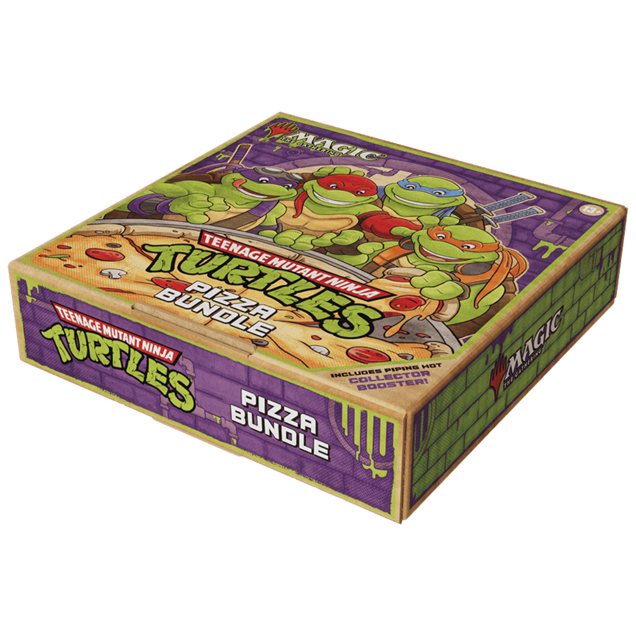 L’extension Teenage Mutant Ninja Turtles pour Magic The Gathering apporte un vent de fraîcheur avec des illustrations exclusives inspirées des quatre tortues Leonardo, Donatello, Raphaël et Michelangelo. Les Pizza Lands sont des terrains de base avec des illustrations thématiques autour de différentes garnitures de pizza, une touche d’humour et de nostalgie qui rend chaque carte unique. Ce qui distingue le Pizza Bundle du Bundle classique, c’est la présence du Collector Booster supplémentaire et des cartes promo exclusives pizza.