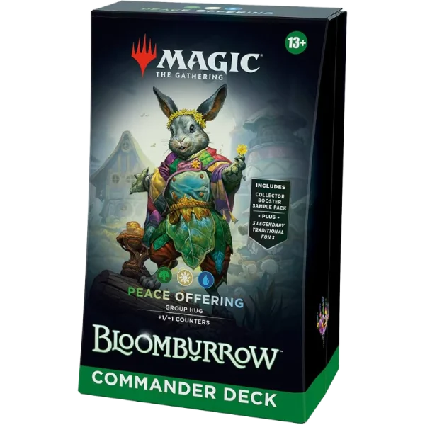 Mots-clรฉs SEO : Commander Deck Bloomburrow, Peace Offering, Ms Bumbleflower, Magic The Gathering anglais, English MTG, deck prรฉconstruit, group hug strategy, marqueurs +1/+1 counters, Vert Blanc Bleu Green White Blue, cartes foil, Commander 2024, Wizards of the Coast, deck box Magic, extension Bloomburrow set, stratรฉgie diplomatique Magic, cartes exclusives Commander